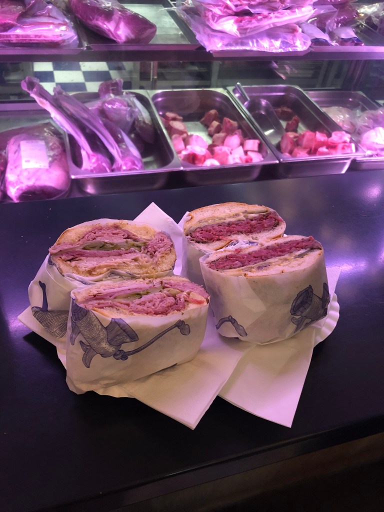 Gelelim bizim gittiğimiz mekânlara. Ben en çok, aslında bir kasap olan ama burger ve etli sandviç de satan Nase Maso’yu beğendim. Burası eski şehrin kuzey tarafında bir pasajın girişindeki kasap dükkânı. İçerisinde sadece bir masa var ve orası doluydu gittiğimizde. Pasajın koridoruna ayakta yemek için masalar koymuşlar, biz öyle yedik. Kapının hemen yanında bir otomat var, siparişinizi oraya girip kredi kartıyla ödüyorsunuz. Biraz sonra siparişiniz geliyor. Ben burger yedim, eşim sandviç aldı. Porsiyonlar küçük gözükse de içindeki et miktarı gayet fazla. Bizim ülkenin tersi yani ve tadı muazzamdı. Hayatımda yediğim en iyi burgerlardan biriydi.