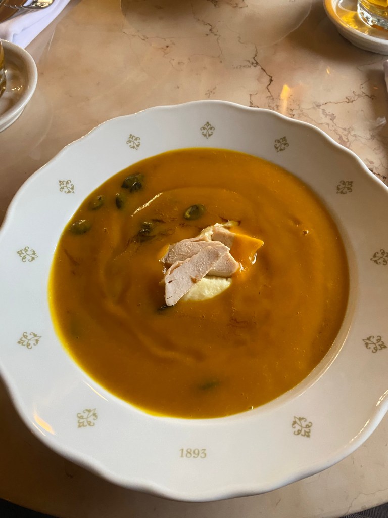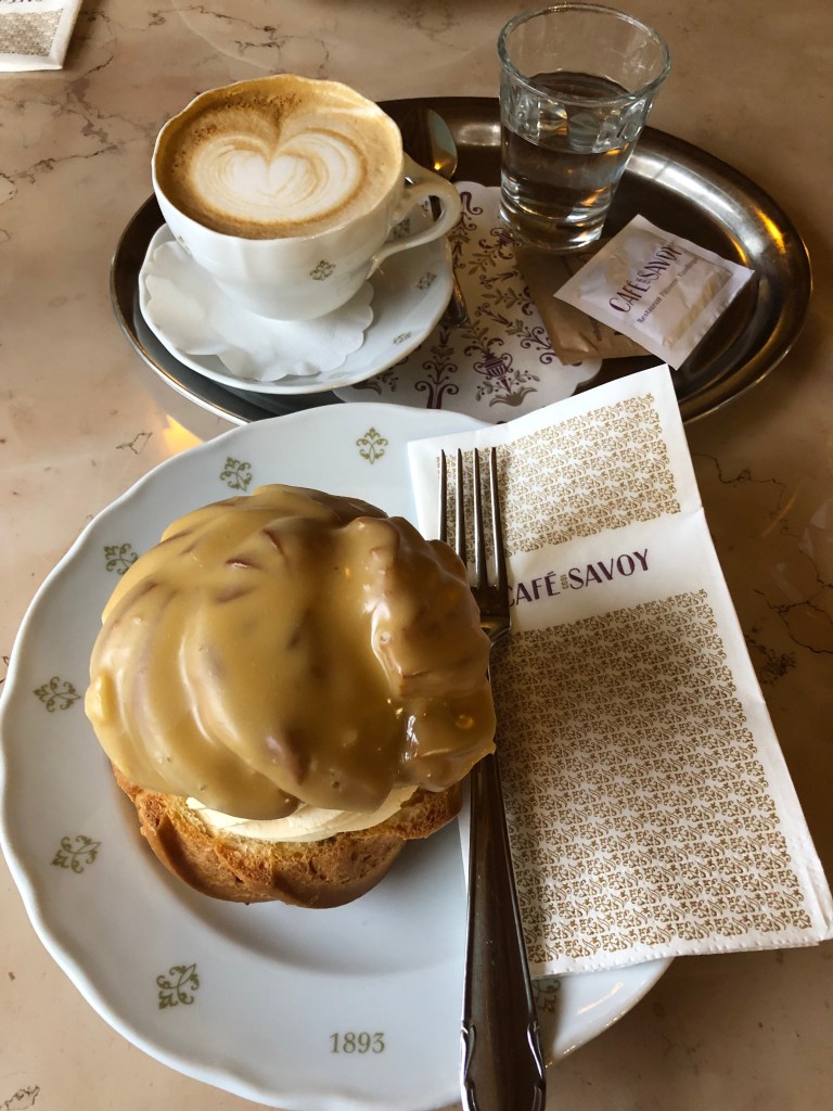 Bir kere dekorasyon çok şık ve içeride hizmet dahil olmak üzere 20. yüzyıl başı havasını korumuşlar. Bu açıdan Viyana’nın asırlık kafelerine benziyor ama bizce farkı, lezzetlerinin de güzel ve farklı olması. Ben tavuk etli balkabağı çorbası aldım, çok lezzetliydi. Eşim şnitzel aldı, bana da biraz verdi, çok iyiydi. Ama esas olay bir Çek tatlısı olan vertnik! Muazzam bir tat, pastacı kremasının pürüzsüzlüğü ve kıvamını unutamıyorum.