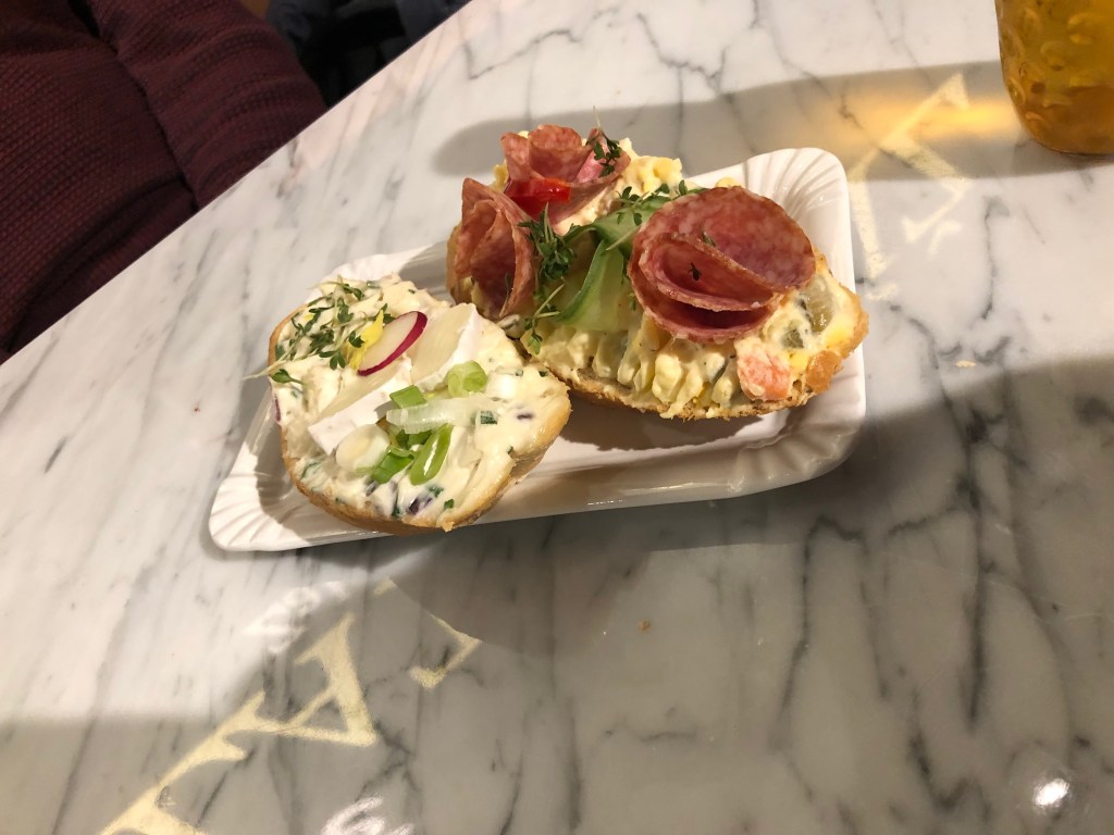 Çekya’da ekmek üstü sandviç, yani tek dilim ekmek üzeri çeşitli malzemeler, gayet popülermiş. Okuduklarıma göre en iyileri Nase Maso’nun komşusu olan Bistro Sister’daymış ama biz aynı yere bir daha gitmek istemediğimizden Lahudky Zlaty Kriz’de yedik. Envai çeşit vardı, birer tane farklı çeşit aldık. Gayet beğendik, tavsiye edilir.