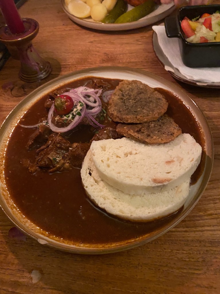 Dinî ya da başka bir hassasiyet sebebiyle domuz eti yemiyor olabilirsiniz, eşim de pek tercih etmez. Ben bayılmasam da yurt dışındayken farklılık olsun diye tercih ediyorum. Bu, Prag’da sadece domuz eti var demek değil, ama etli yemekler genelde domuzlu ve ben gayet memnun kaldım. Bloglarda ‘pork knuckle (domuz budu)’ özellikle öneriliyordu ama porsiyonları büyük olduğundan ve tek kişi cesaret edemediğimden yiyemedim.