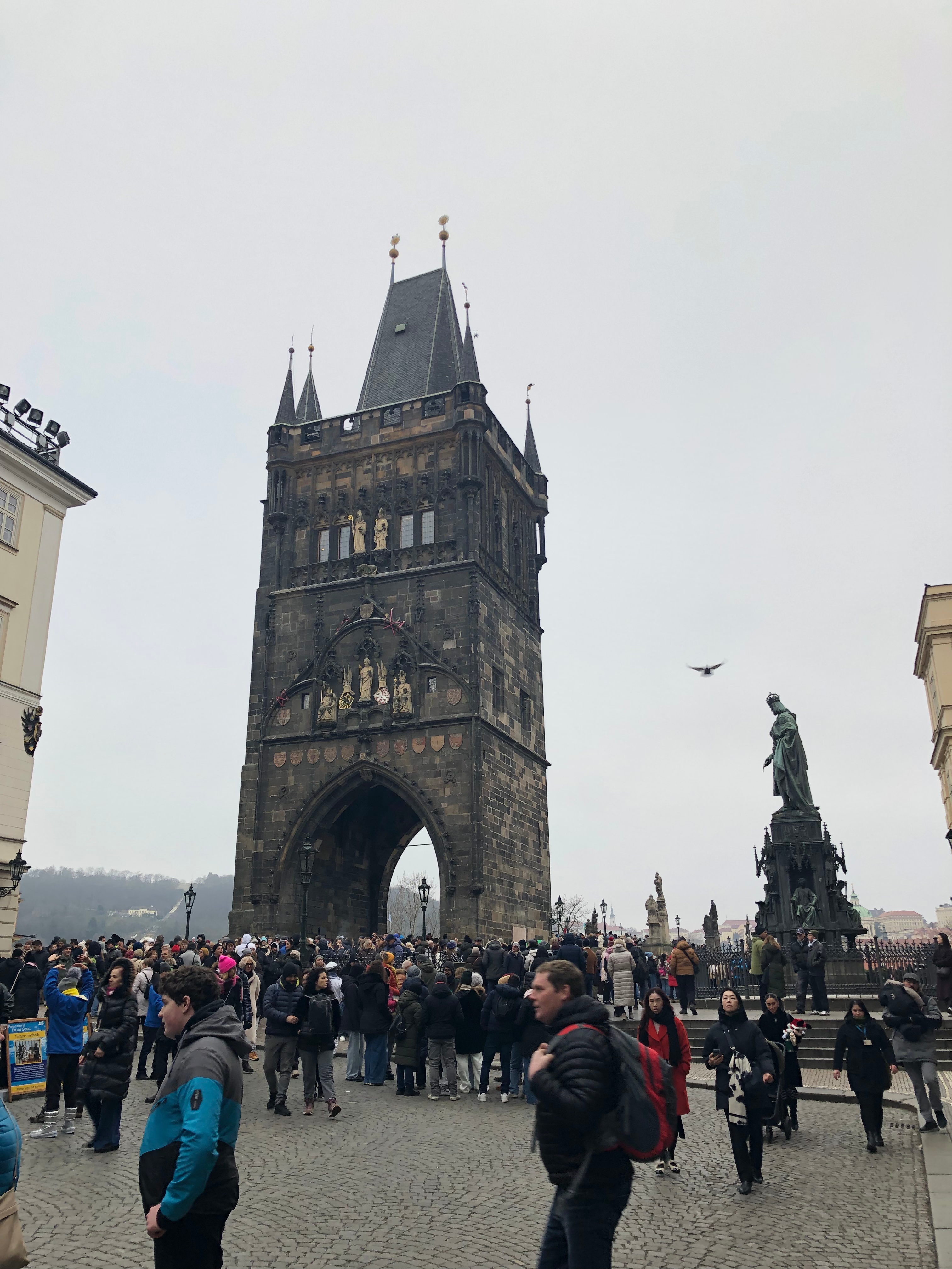 Aynı şeyler kentin en önemli köprüsü Charles Köprüsü için de geçerli. Araç trafiğine kapalı olmasına rağmen öyle bir yaya trafiğine sahip ki bu köprü, birkaç kez ezilme tehlikesi geçirdik. Köprünün iki kenarı da heykellerle süslü ve her heykelin yine görünen ve gizli anlamları mevcut. Mesela dilek heykeli gibi, insanlar dokunup dilek diliyor, görmemeniz imkânsız.